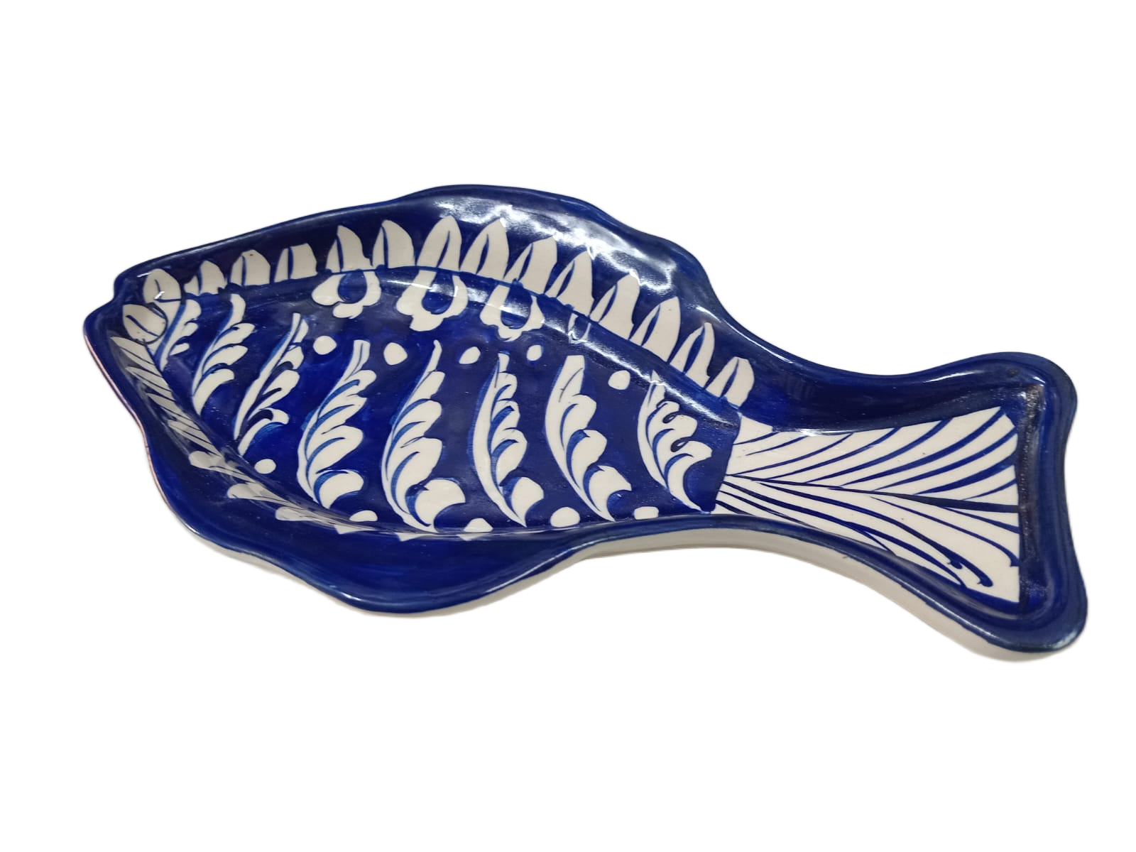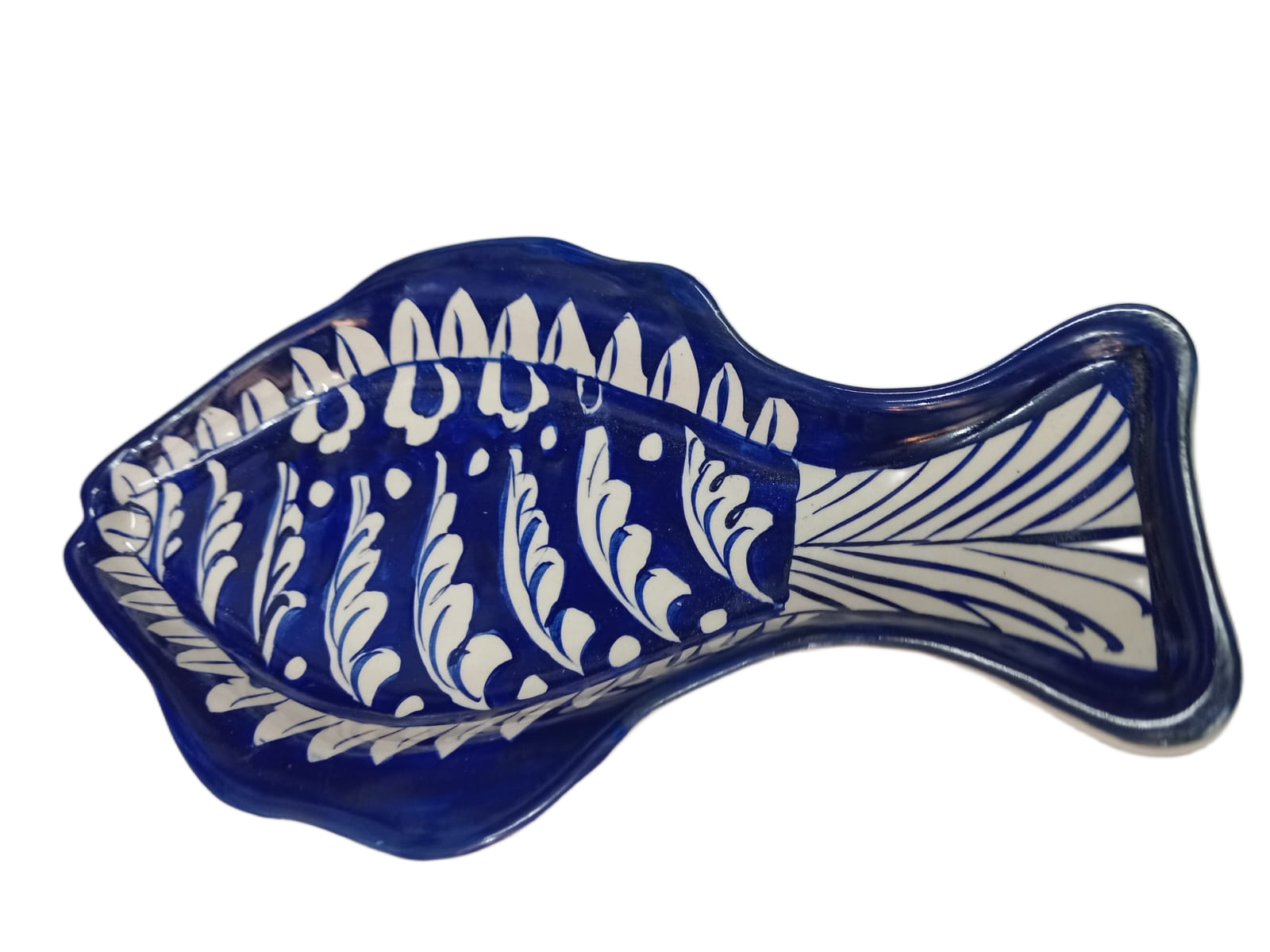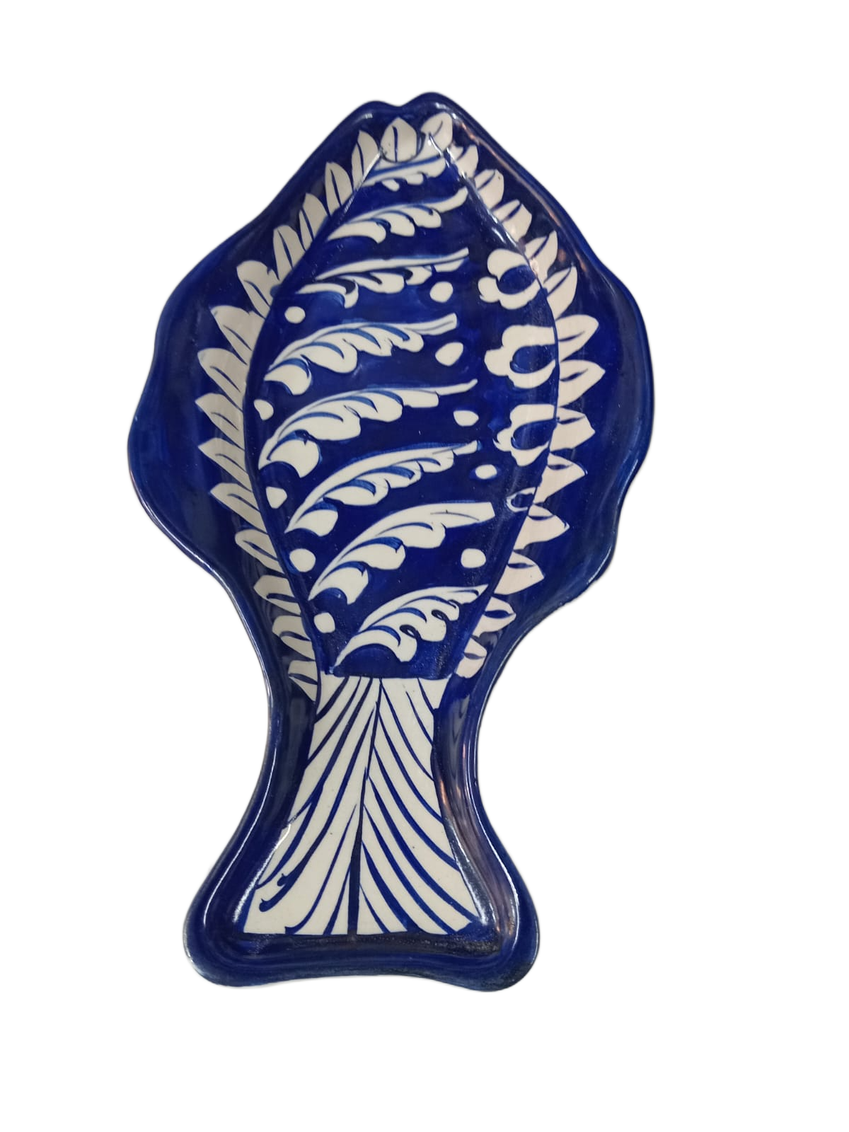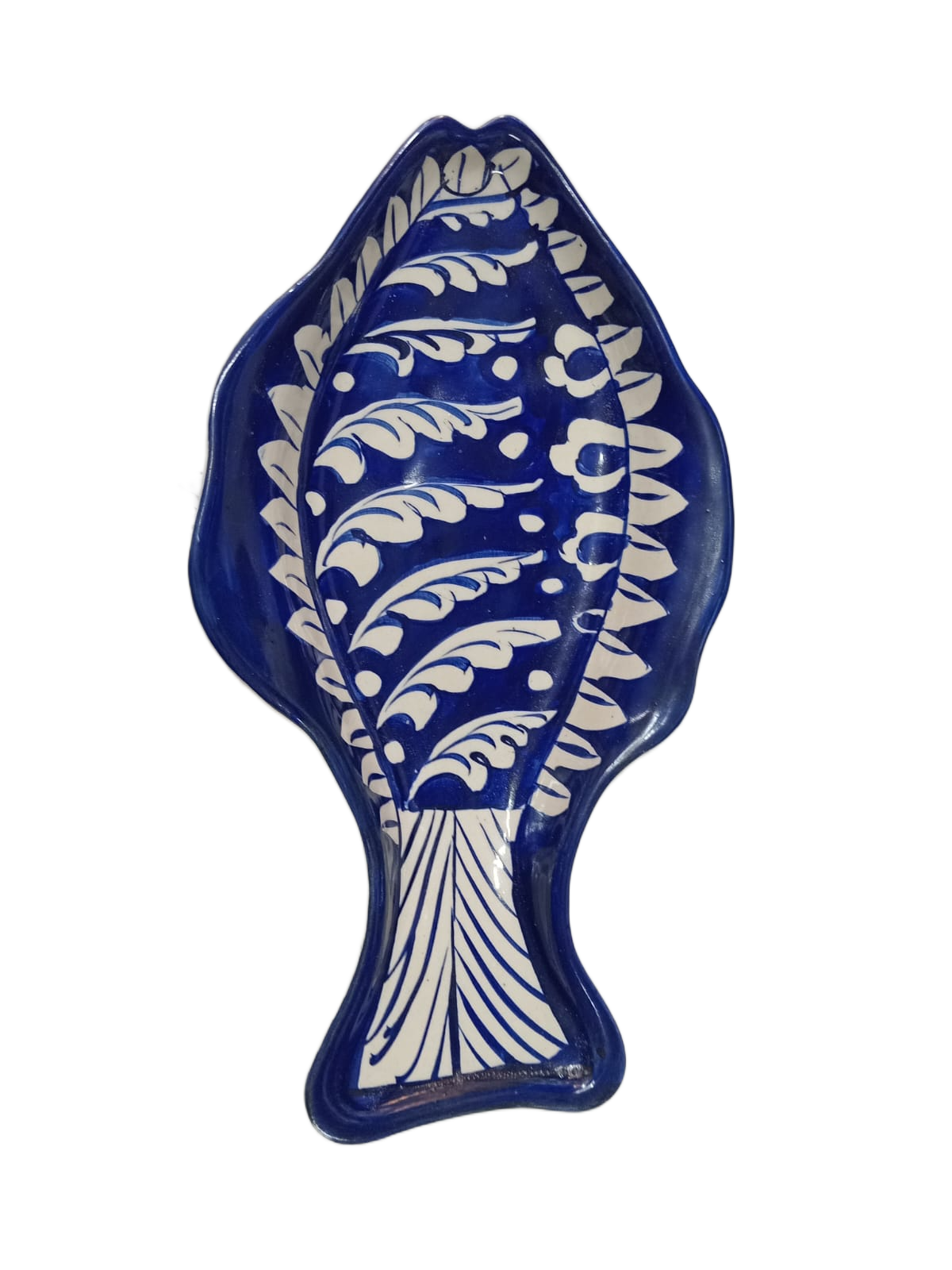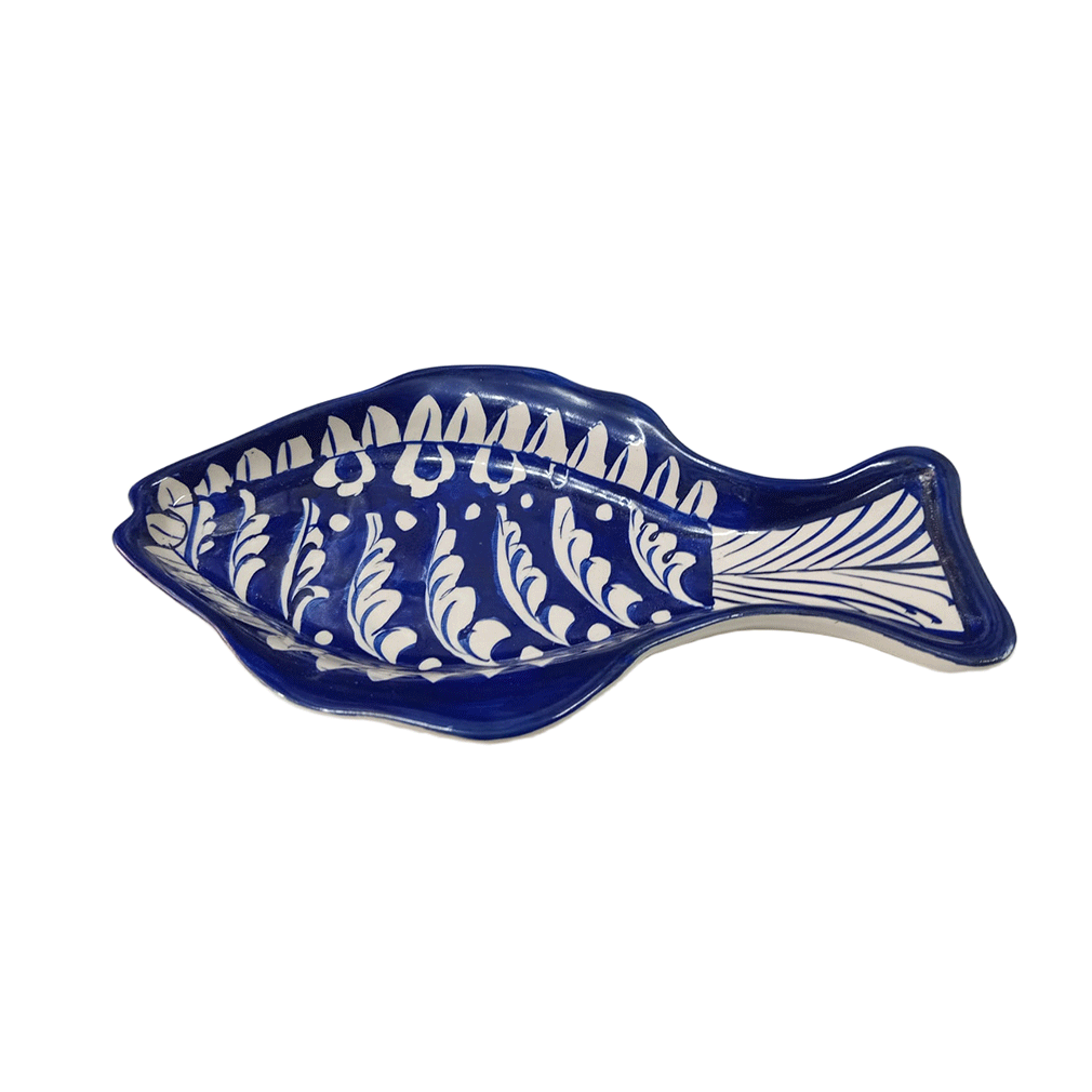 A beautifully handcrafted fish-shaped tray inspired by traditional blue pottery artistry, perfect for serving or décor.