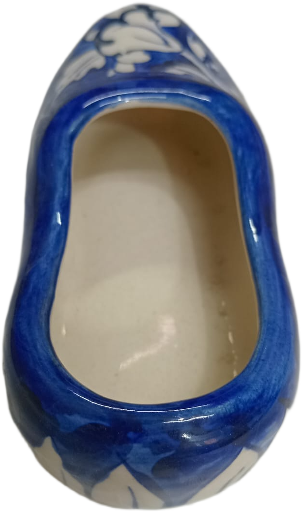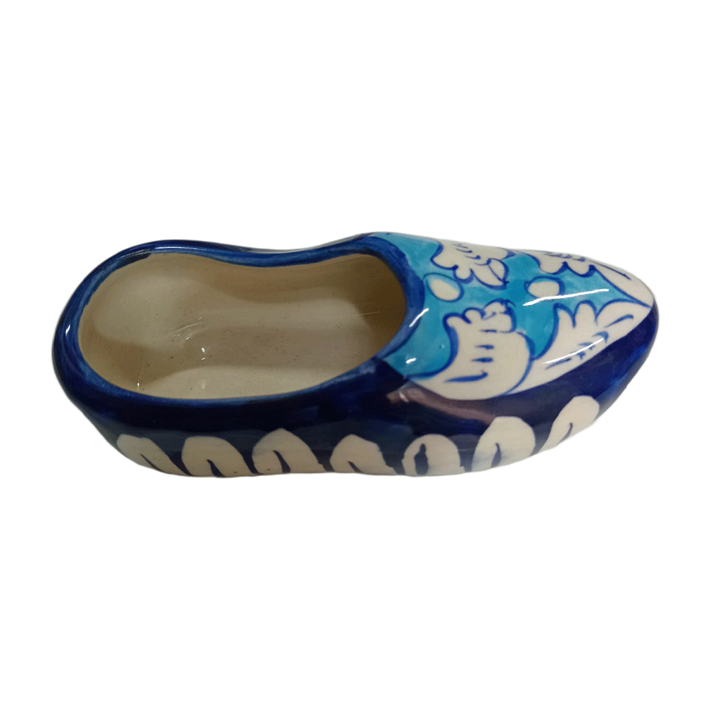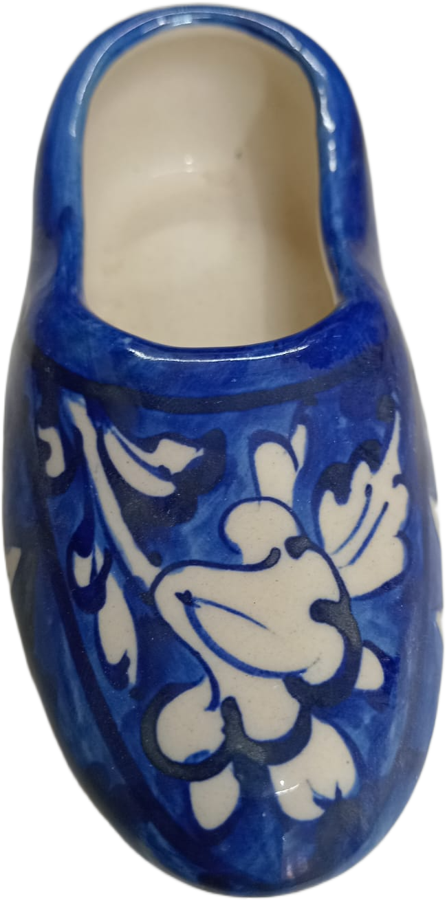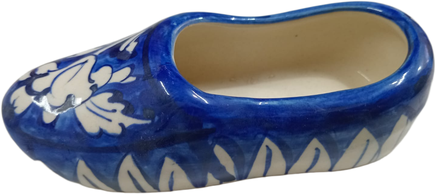 This beautifully handcrafted blue pottery shoe is a unique decorative item inspired by traditional craftsmanship. Designed in an elegant shoe shape, it showcases intricate hand-painted patterns that reflect cultural artistry and attention to detail. The smooth glazed finish enhances its refined look, making it an eye-catching addition to any space.