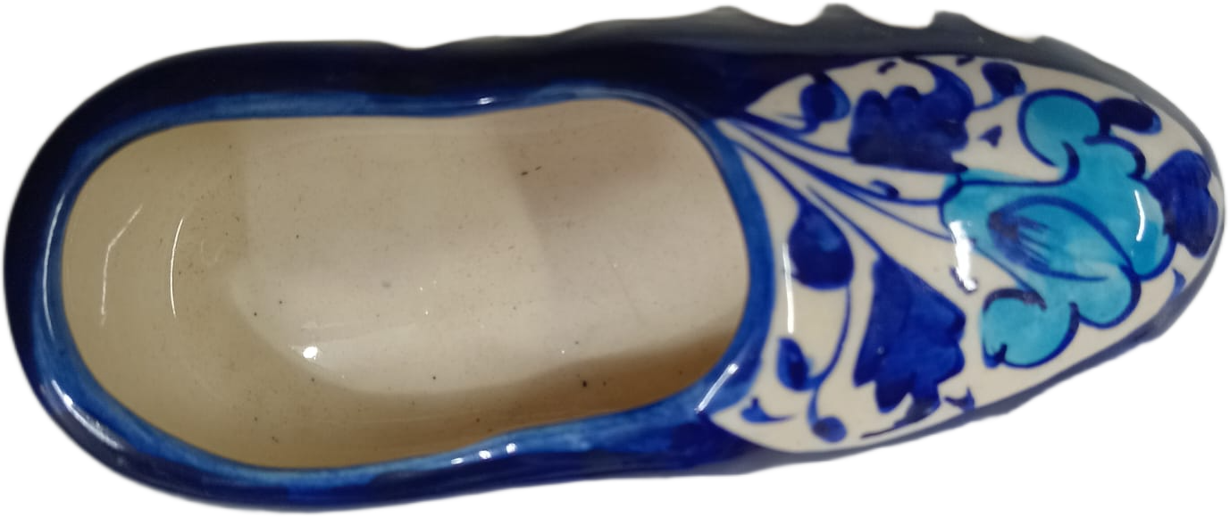 This beautifully handcrafted blue pottery shoe is a unique decorative item inspired by traditional craftsmanship. Designed in an elegant shoe shape, it showcases intricate hand-painted patterns that reflect cultural artistry and attention to detail. The smooth glazed finish enhances its refined look, making it an eye-catching addition to any space.
