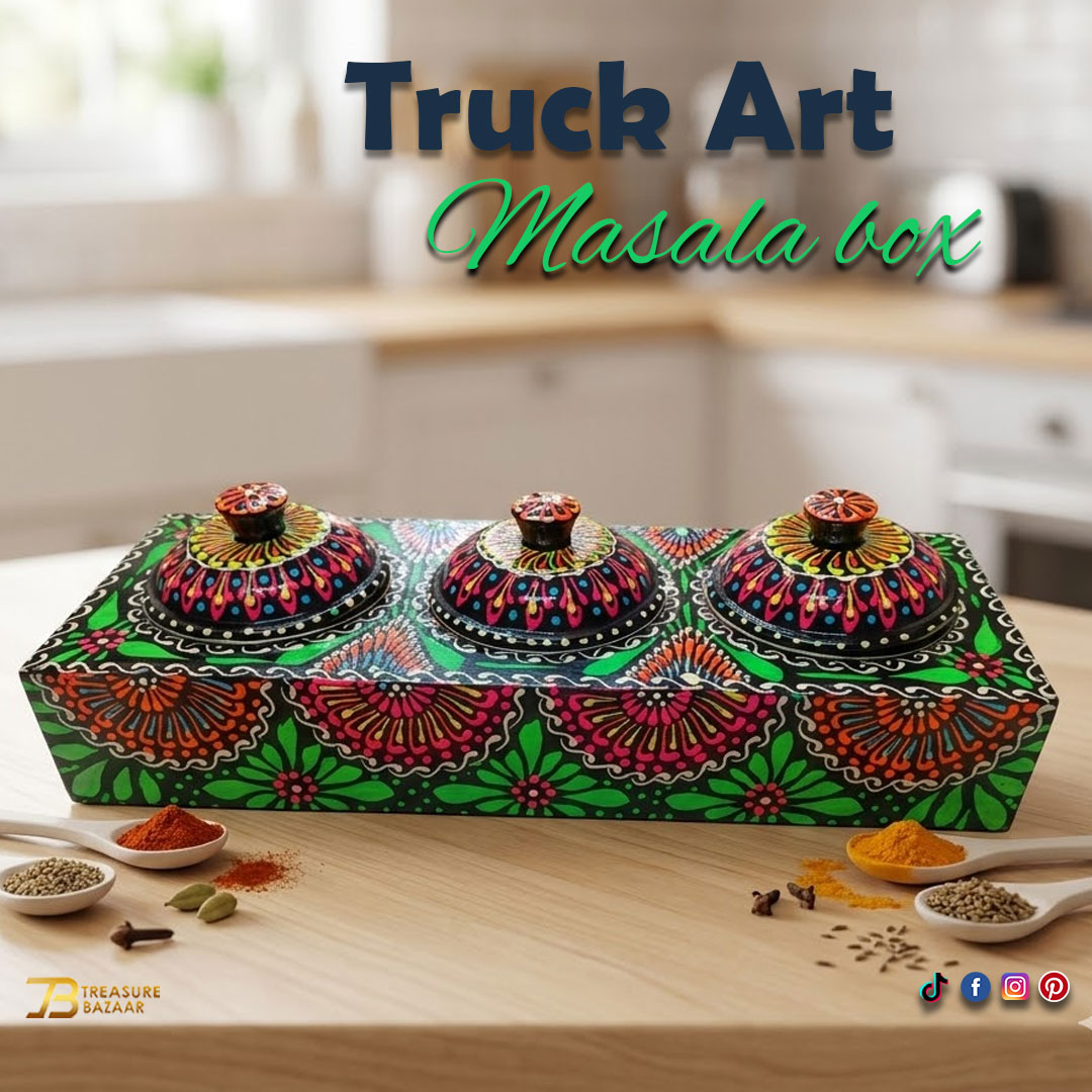 A beautifully handcrafted chamakpatti masala box tray with three compartments, featuring vibrant truck art design. Perfect for organizing spices in style.