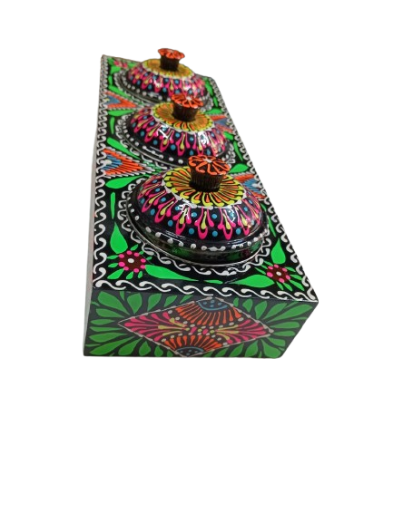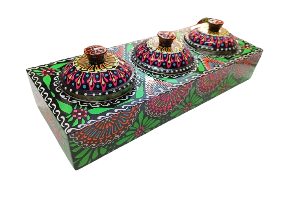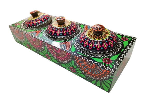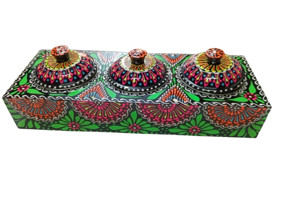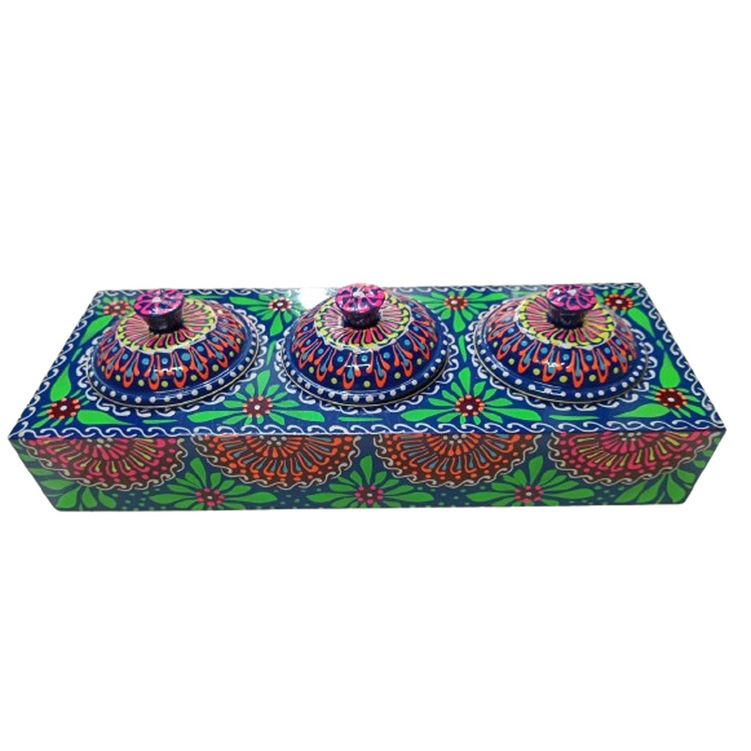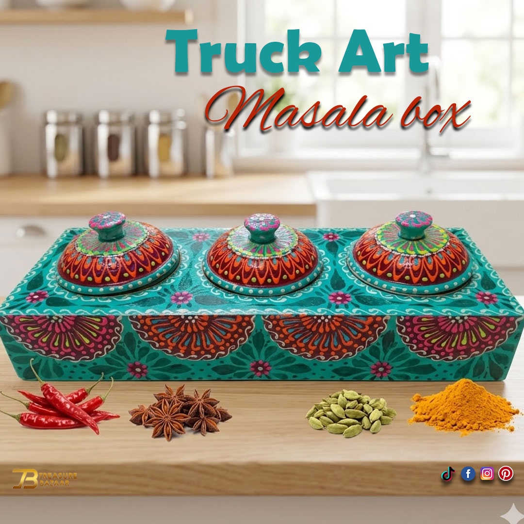 A beautifully handcrafted chamakpatti masala box tray with three compartments, featuring vibrant truck art design. Perfect for organizing spices in style.