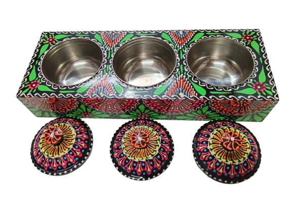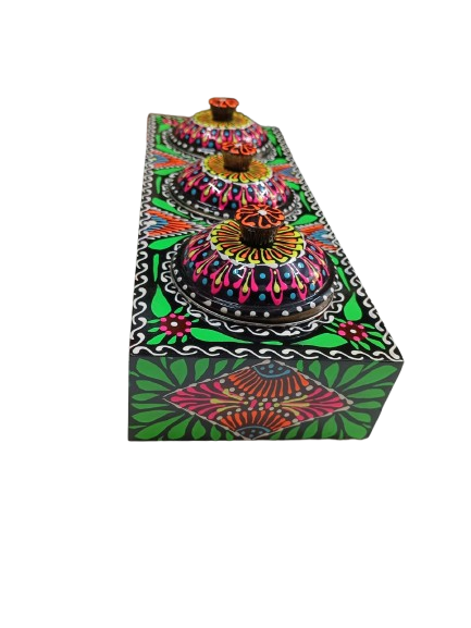 Add a touch of traditional charm to your kitchen with this stunning Chamakpatti 3 Masala Box Tray. Inspired by classic truck art, this handcrafted piece features intricate patterns and bold, vibrant colors that instantly catch the eye. The tray comes with three separate compartments, each with a lid, making it ideal for storing and organizing different spices, condiments, or small kitchen essentials.