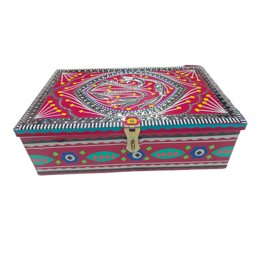 A magnificent specimen of traditional Pakistani workmanship, this Chamakpatti Box displays the elaborate and colorful art style that was influenced by truck art. This box, which is decorated with geometric patterns, reflective details, and vibrant floral motifs, is a useful storage solution as well as a work of art. Its sturdy build and safe clasp make it perfect for keeping things organized, and its vibrant and striking design brings color and culture to any area.