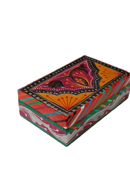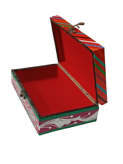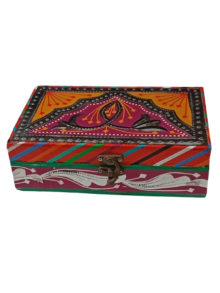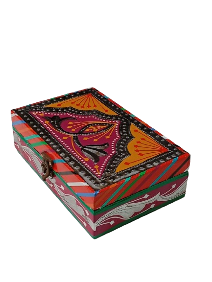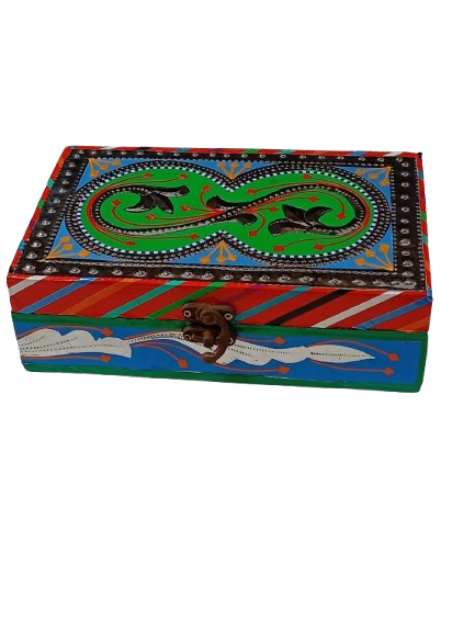 This beautifully crafted Chamakpatti box showcases traditional artistry with its bold colors, intricate patterns, and decorative mirror accents. Designed with a sturdy wooden base, the box is adorned using the classic Chamakpatti technique, known for its bright motifs and reflective embellishments. The secure metal clasp ensures your valuables are safely stored, while the eye-catching design makes it a charming addition to any space. Ideal for keeping jewelry, trinkets, or special mementos, this box blends functionality with cultural elegance.