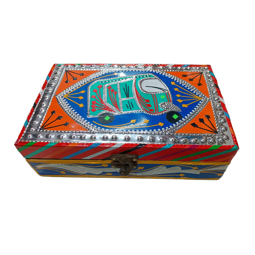 This beautifully crafted Chamakpatti box showcases traditional artistry with its bold colors, intricate patterns, and decorative mirror accents. Designed with a sturdy wooden base, the box is adorned using the classic Chamakpatti technique, known for its bright motifs and reflective embellishments. The secure metal clasp ensures your valuables are safely stored, while the eye-catching design makes it a charming addition to any space. Ideal for keeping jewelry, trinkets, or special mementos, this box blends functionality with cultural elegance.