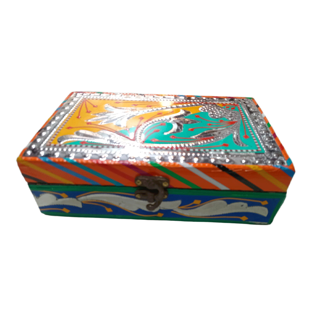 This beautifully crafted Chamakpatti box showcases traditional artistry with its bold colors, intricate patterns, and decorative mirror accents. Designed with a sturdy wooden base, the box is adorned using the classic Chamakpatti technique, known for its bright motifs and reflective embellishments. The secure metal clasp ensures your valuables are safely stored, while the eye-catching design makes it a charming addition to any space. Ideal for keeping jewelry, trinkets, or special mementos, this box blends functionality with cultural elegance.