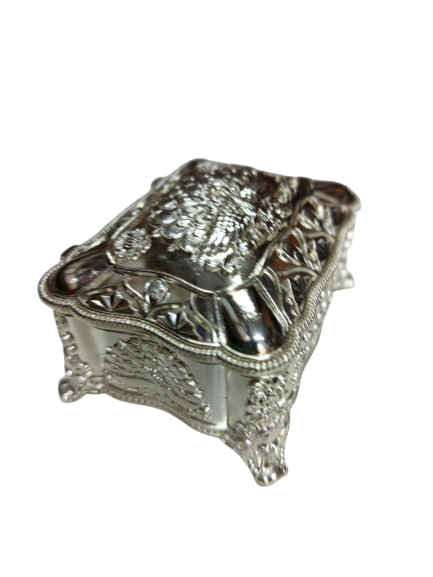 A beautifully crafted small silver box with intricate detailing, perfect for storing jewelry or small valuables while adding a touch of elegance to your space.