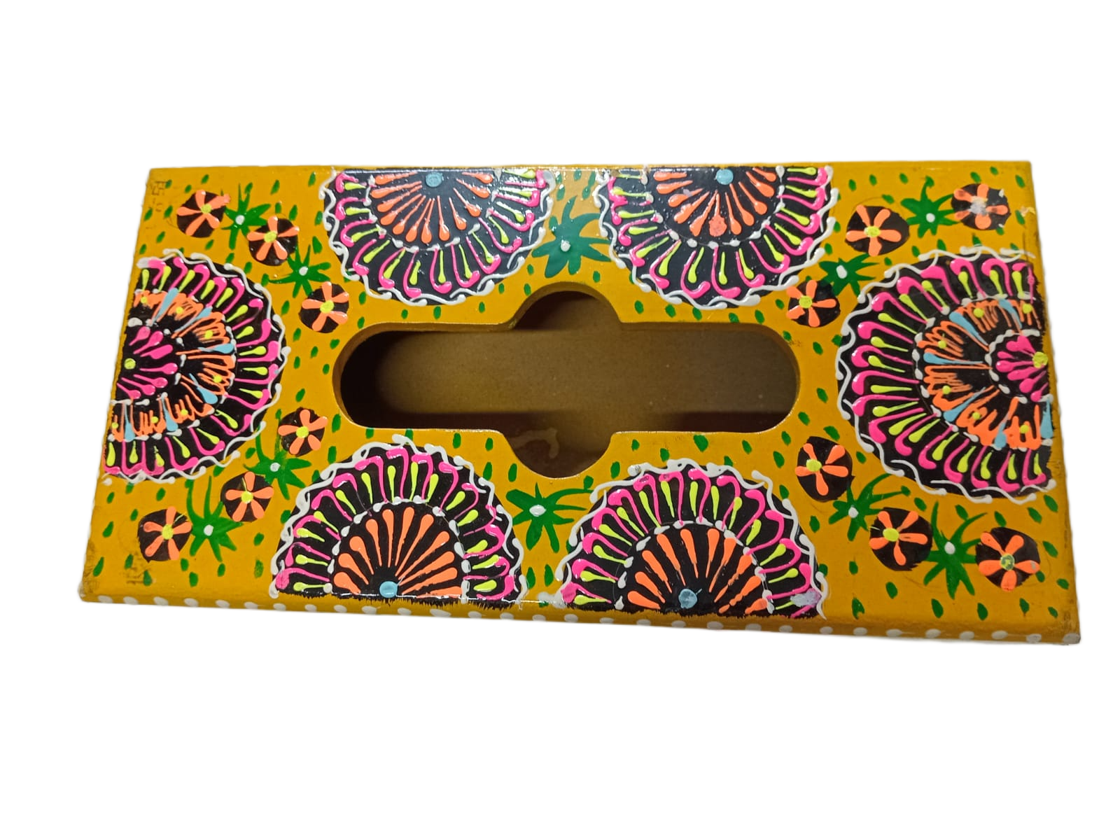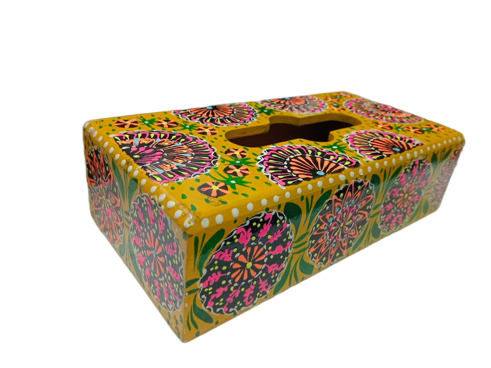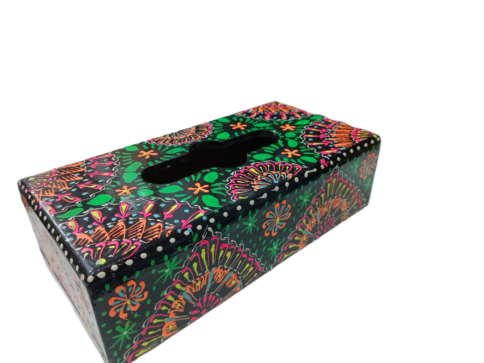 Enhance your home décor with this stunning handcrafted wooden tissue box, designed to combine functionality with artistic charm. Featuring intricate floral patterns in vibrant hues, this tissue box brings a lively and traditional touch to any room. The detailed hand-painted design highlights fine craftsmanship, making each piece unique and eye catching.