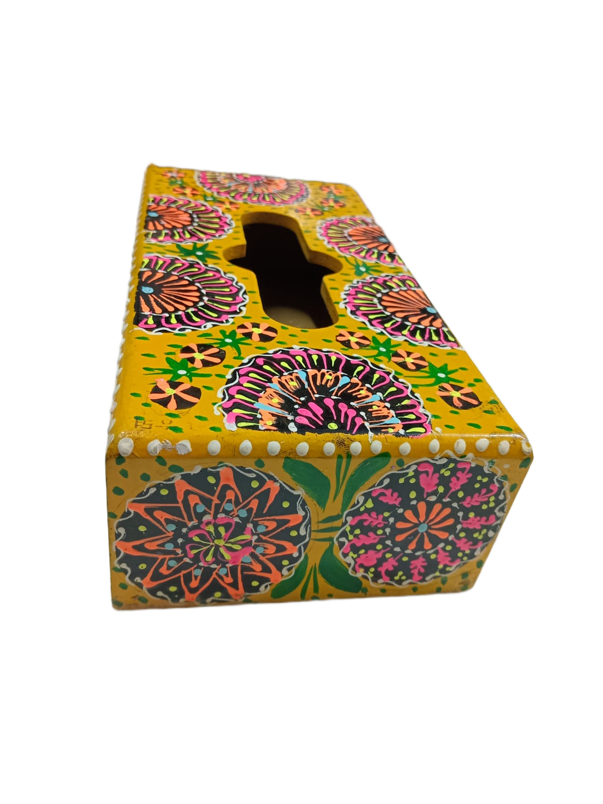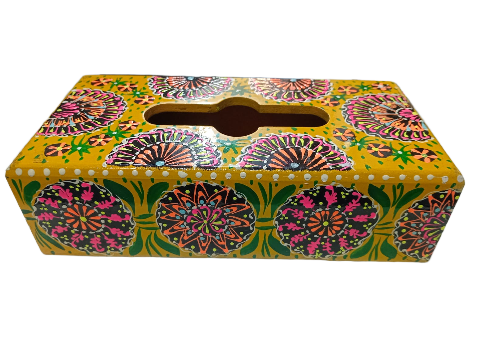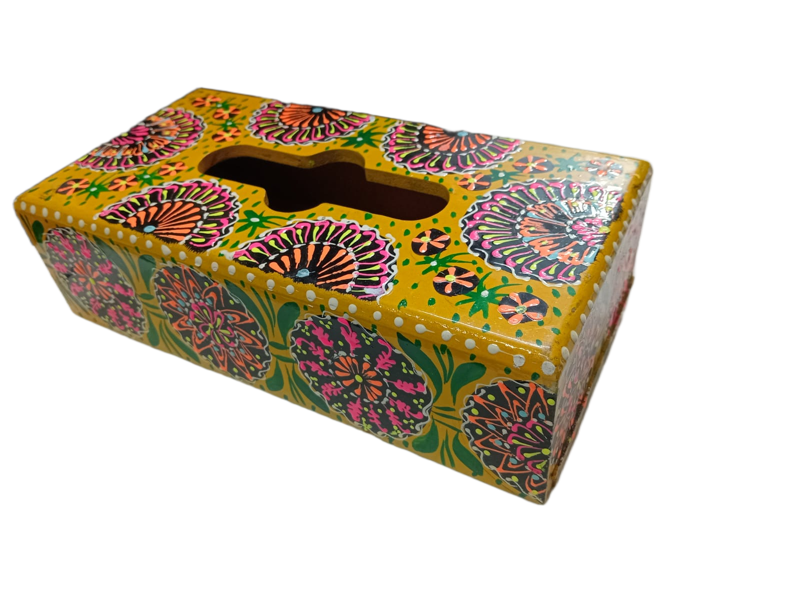 Enhance your home décor with this stunning handcrafted wooden tissue box, designed to combine functionality with artistic charm. Featuring intricate floral patterns in vibrant hues, this tissue box brings a lively and traditional touch to any room. The detailed hand-painted design highlights fine craftsmanship, making each piece unique and eye catching.