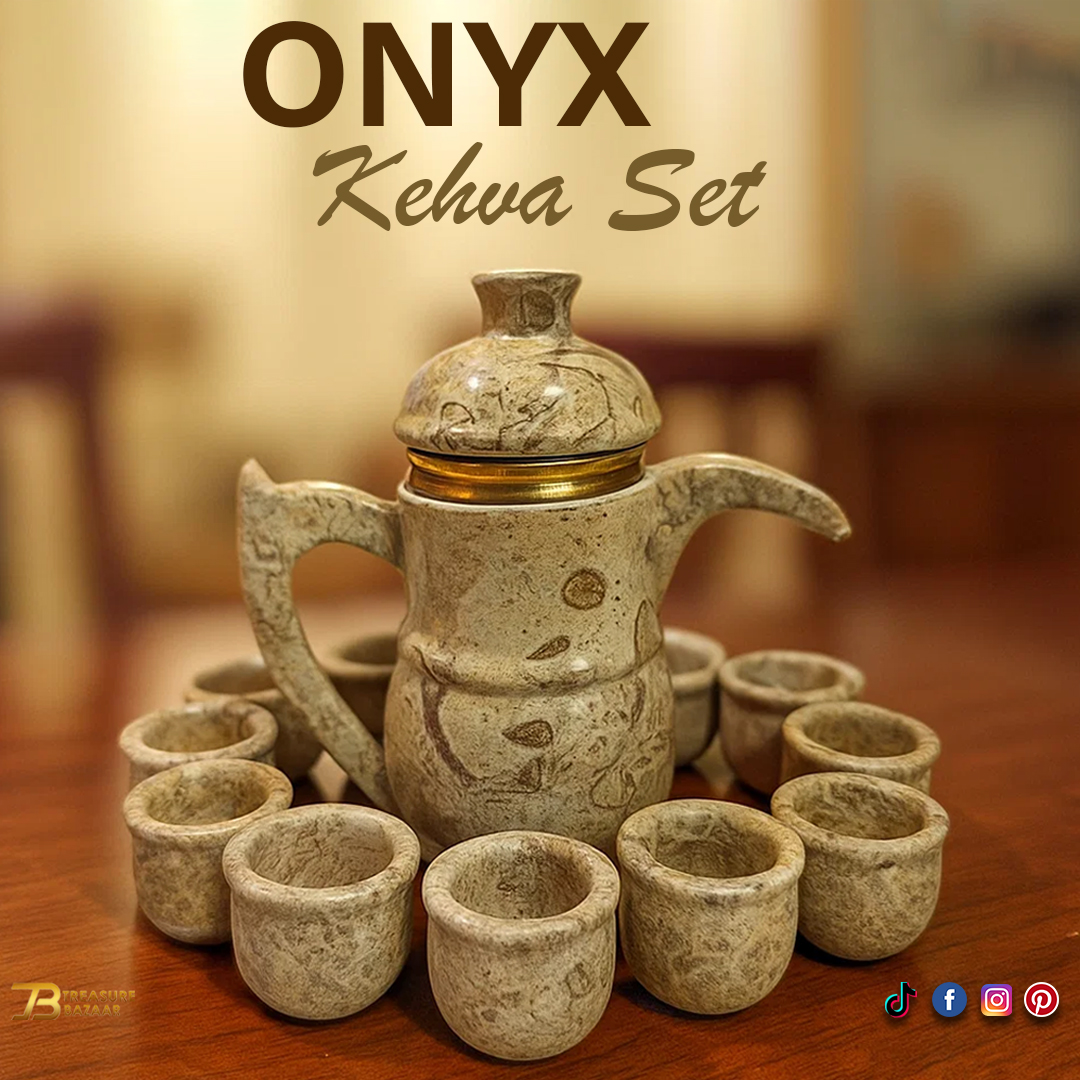Elevate your serving style with this exquisite 11-piece Kehva set , skillfully handcrafted from high-quality onyx stone. The set includes a stunning traditional Dallah-style jug and ten matching cups, each displaying the natural veining and rich earthy tones of genuine onyx. Perfect for serving Arabic coffee or as a decorative showpiece, this luxurious set brings timeless elegance and cultural charm to your home. A thoughtful gift for collectors, housewarmings, or anyone who values artisanal craftsmanship and heritage-inspired décor.