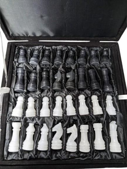 A beautifully handcrafted onyx and white marble chess board set with elegant stone pieces. Ideal for display, gifting, or enjoying timeless games in style.
