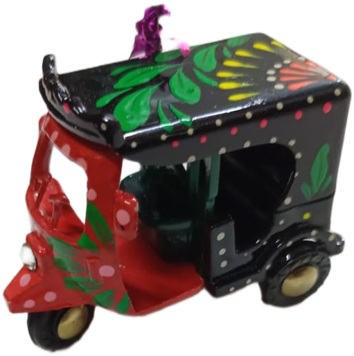 This Mini Multi-Color Rickshaw Model is a beautiful representation of traditional Pakistani truck art.it features hand-painted floral patterns and decorative dots that reflect the lively style of real rickshaws seen on the streets of Pakistan