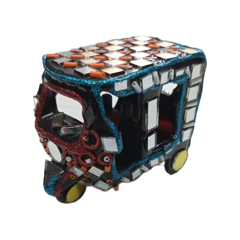 This Mini Multi-Color Rickshaw Model is a beautiful representation of traditional Pakistani truck art.it features hand-painted floral patterns and decorative dots that reflect the lively style of real rickshaws seen on the streets of Pakistan