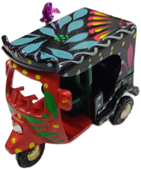 This Mini Multi-Color Rickshaw Model is a beautiful representation of traditional Pakistani truck art.it features hand-painted floral patterns and decorative dots that reflect the lively style of real rickshaws seen on the streets of Pakistan