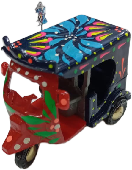 This Mini Multi-Color Rickshaw Model is a beautiful representation of traditional Pakistani truck art.it features hand-painted floral patterns and decorative dots that reflect the lively style of real rickshaws seen on the streets of Pakistan