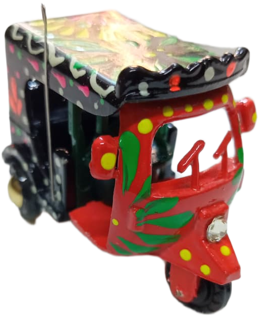 This Mini Multi-Color Rickshaw Model is a beautiful representation of traditional Pakistani truck art.it features hand-painted floral patterns and decorative dots that reflect the lively style of real rickshaws seen on the streets of Pakistan