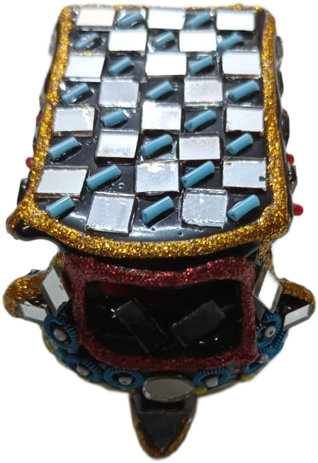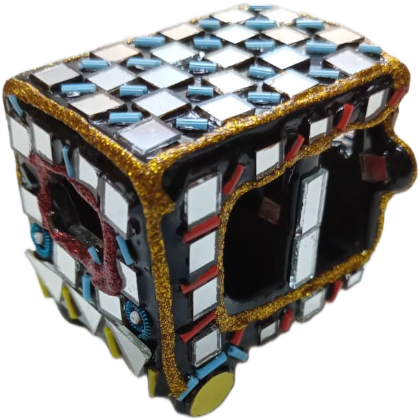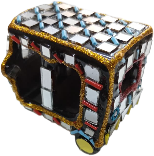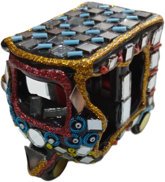 This minature Mirror Rickshaw Model is a stunning piece of traditional Pakistani truck art craftsmanship. Designed with vibrant colors, decorative mirrors, and detailed patterns, this miniature rickshaw reflects the lively culture and artistic style seen on real decorated rickshaws in Pakistan.