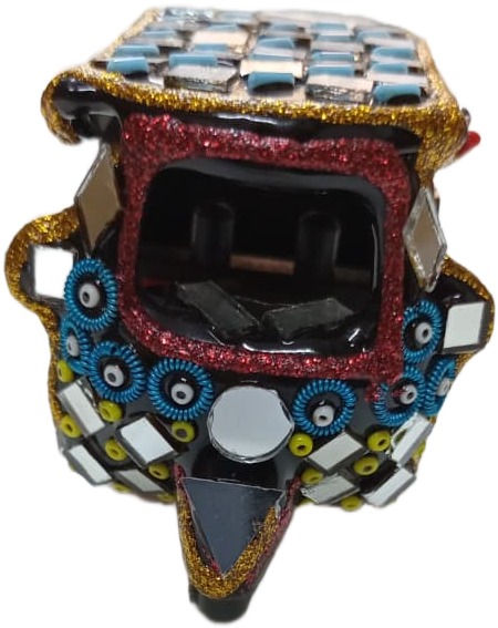 This minature Mirror Rickshaw Model is a stunning piece of traditional Pakistani truck art craftsmanship. Designed with vibrant colors, decorative mirrors, and detailed patterns, this miniature rickshaw reflects the lively culture and artistic style seen on real decorated rickshaws in Pakistan.