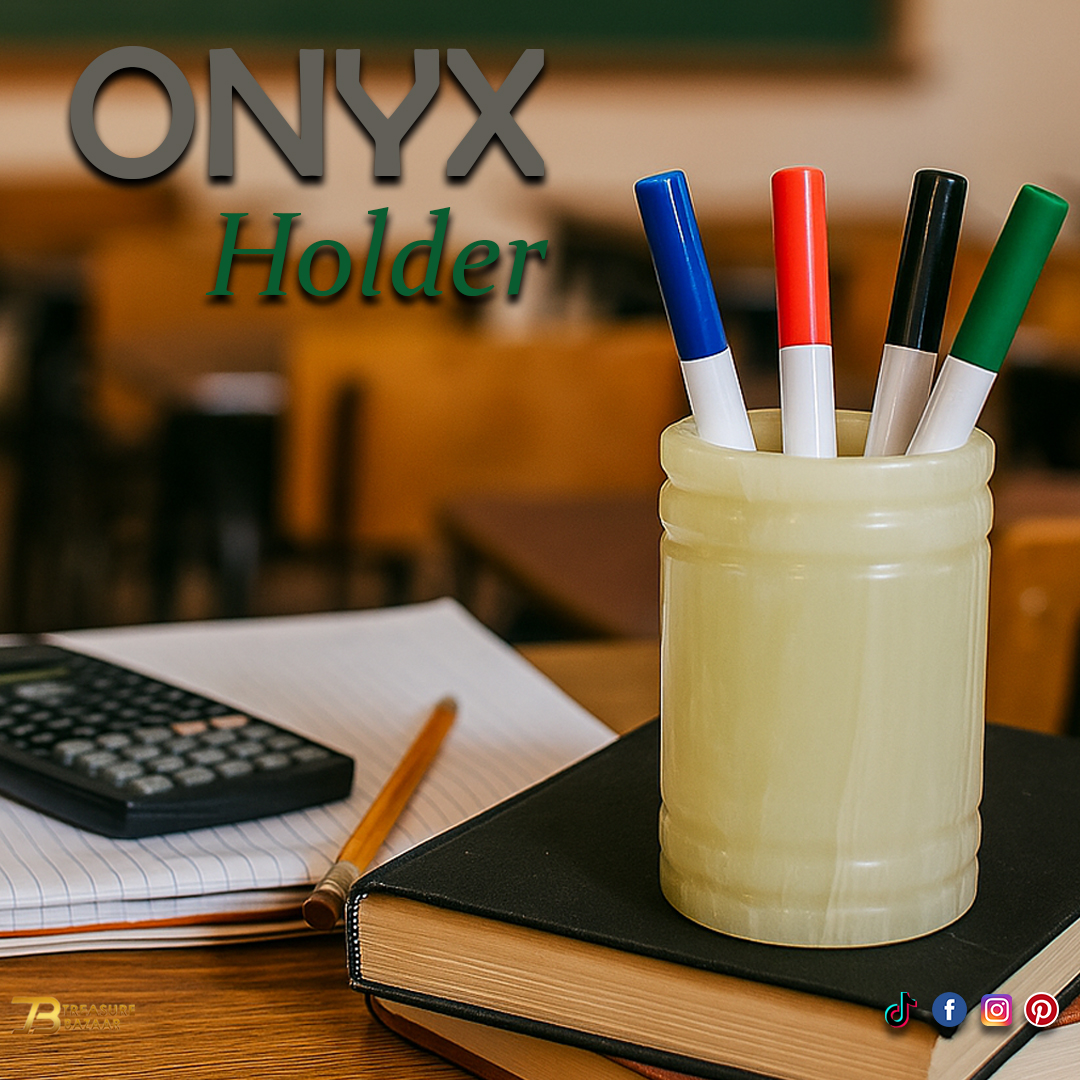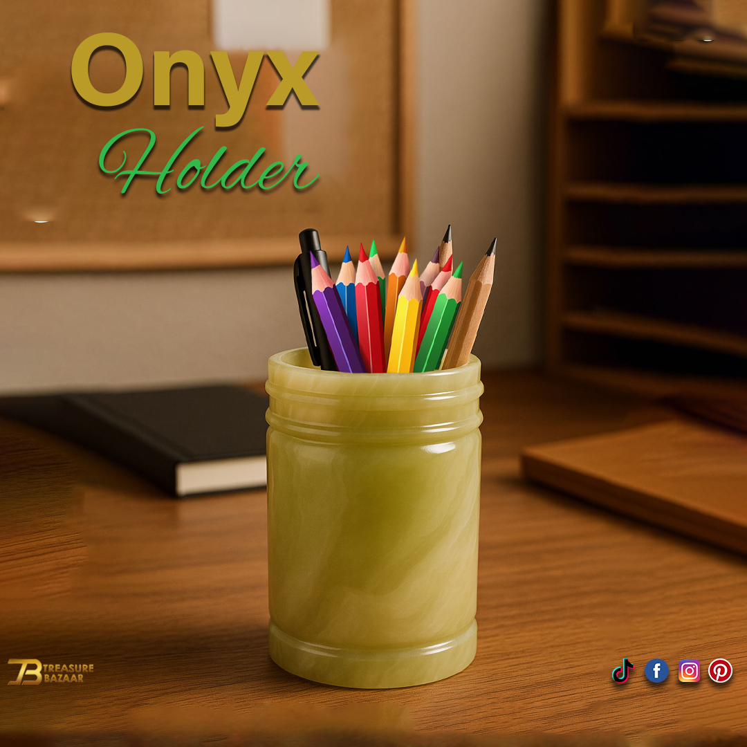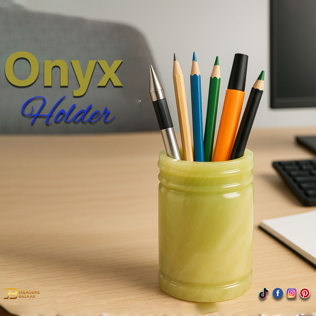 Elegant, sturdy, simple and traditional Pen Jar, these onyx Candy Jar are made using the finest marble, carved and then polished to enhance the natural details of the stone. Onyx is a grounding and protective crystal that helps to calm your fears. Natural onyx Pen Jar. Decorative Pen Jar for Homedecor, elegant onyx for your office and home gifts. Easily washable and scorch proof. vintage high quality. Unique and elegant. The color swirls you can see on the Pen Jar are natural. Each onyx stone is distinct from other. Best for home & office décor. Perfect for indoor use and coffee tables and patios.