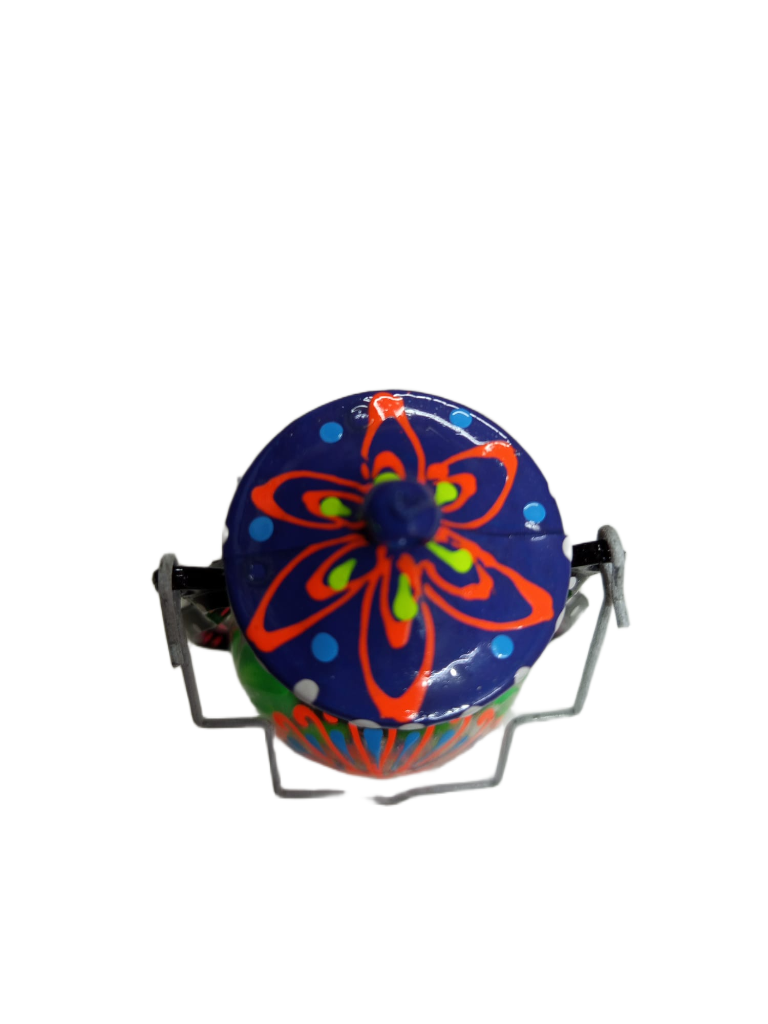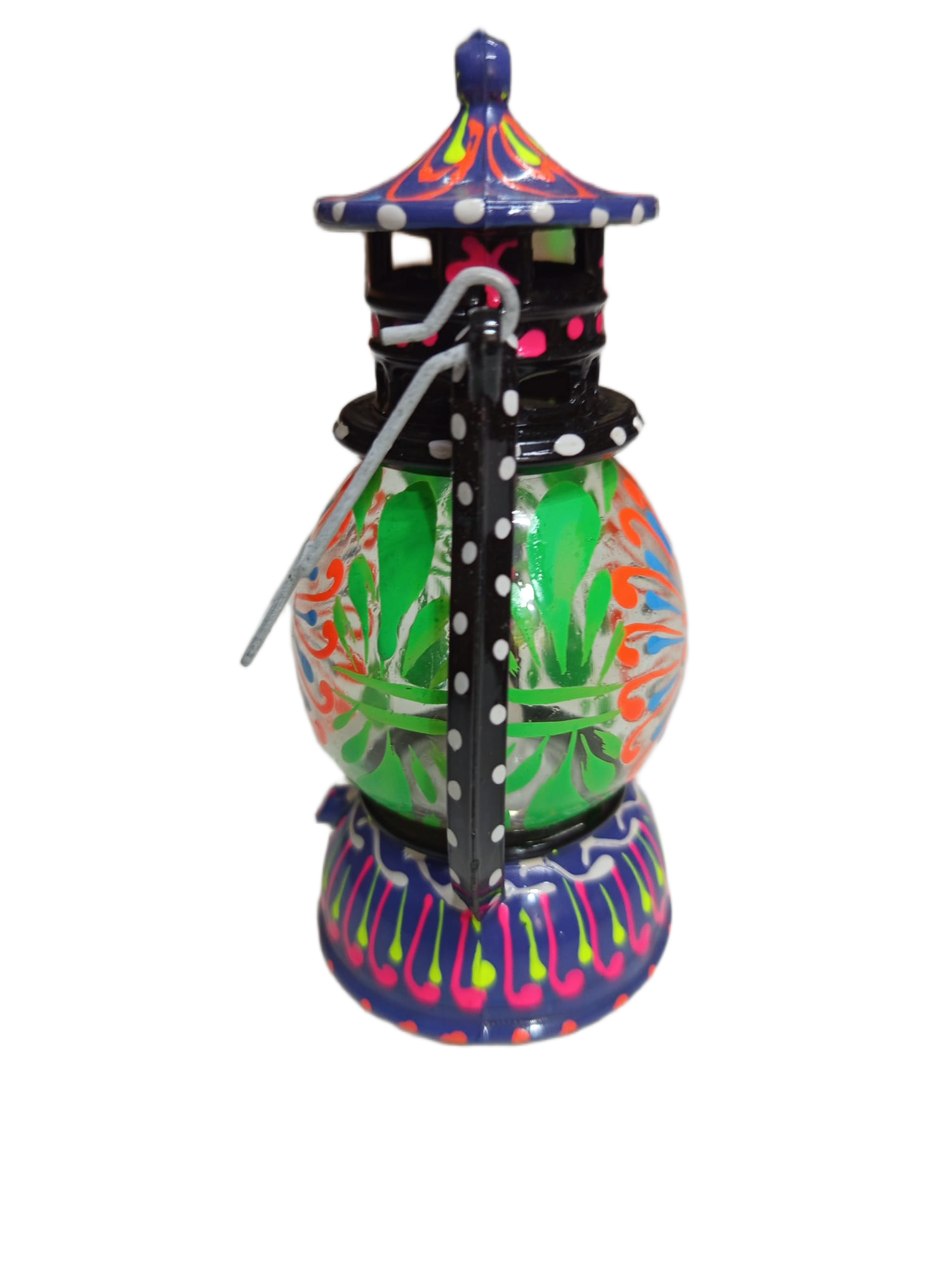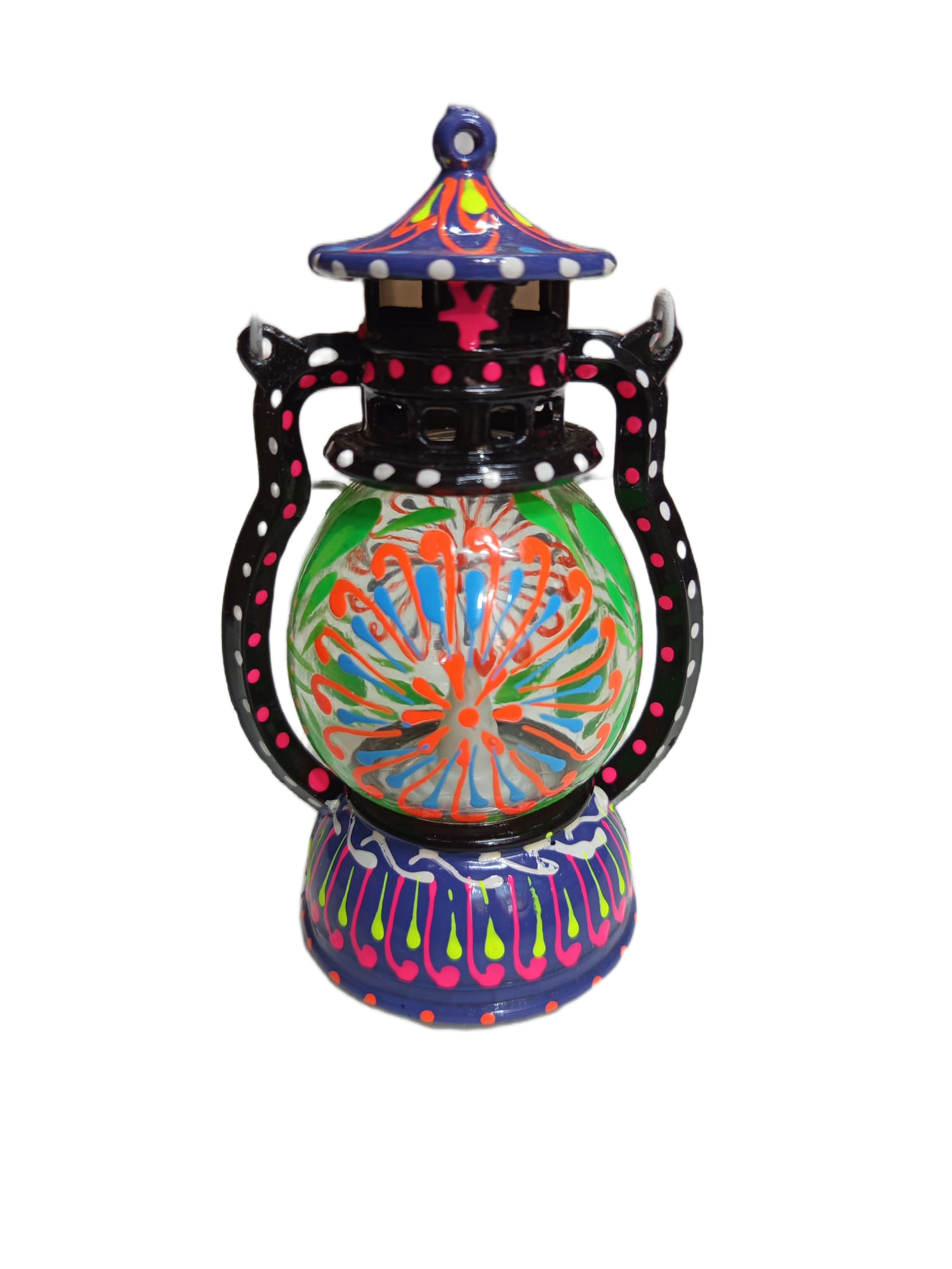 A handcrafted decorative lantern inspired by traditional truck art, featuring intricate patterns and vibrant detailing.