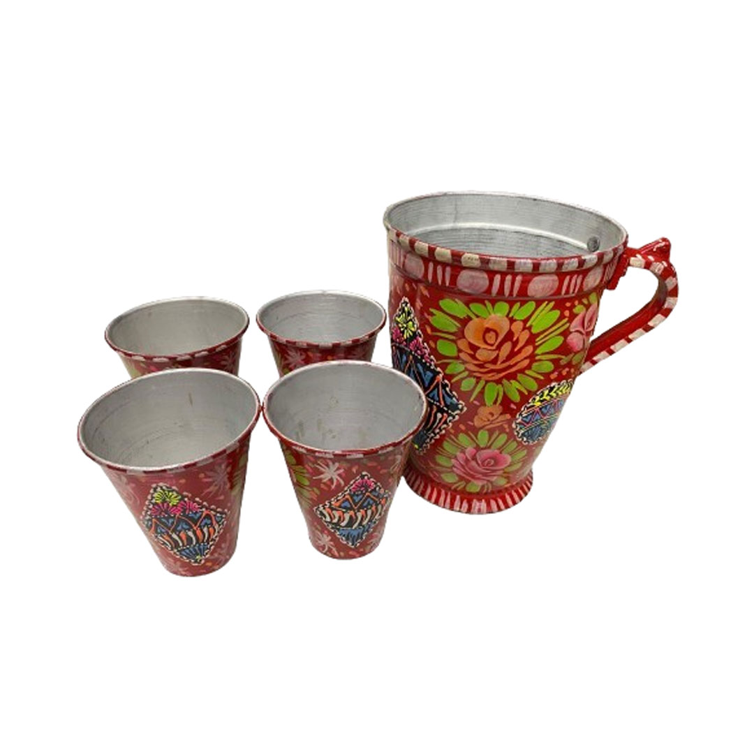 - Beautifully attractive hand painted metal water set that keeps water cold for a long time.Add some style to your drink ware by stunning colorful floral patterns. Intricately detailed with hand-painted patterns and add the finishing touch to your table setting.Available in several gorgeous designs.Perfect for water,juice or your favorite mocktail. Beautiful addition to any table.Washable and water resistant.Brighten up your meal times with this vintage hand-painted set.The detailing of painting and finishing is a joy to pour from and something to your display.Enjoy serving your guests in this utterly gorgeous set. For decoration or dining purpose.Best for gifts. Color me vary as all items are hand crafted. wide range have been designed to keep the trend of hand painted truck art alive.This classic hand printed jug and glasses will never go out of style.