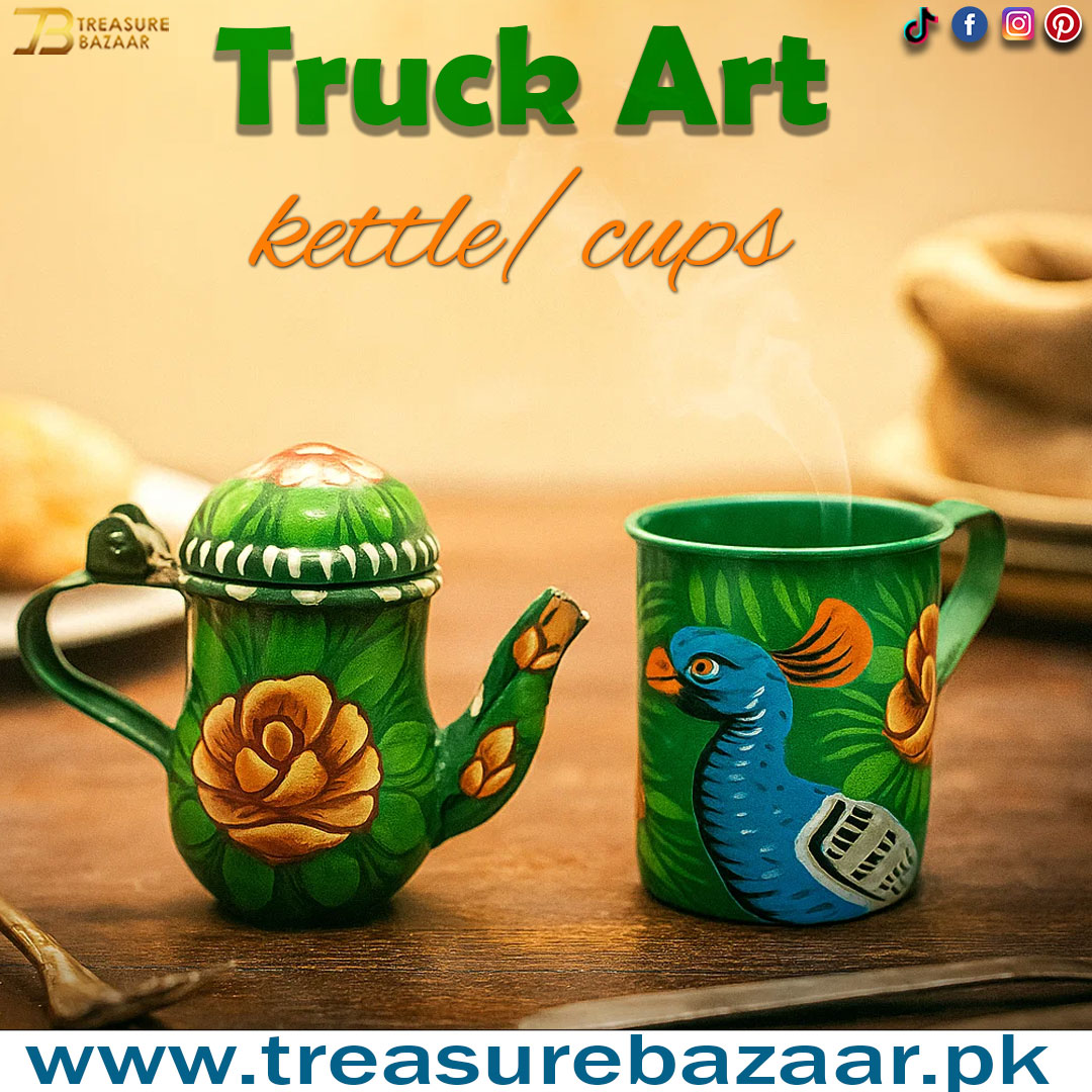 Hand painted table ware. Best selection of unique tea set. Beautiful decorative tea kettle with cups is truly a delight for art lovers and makes this set rare and precious. Each piece is adorned with motifs and patterns reflecting the unique and amazing Pakistani truck art. This artistic kettle set is perfect for gifting your love ones or any corporate occasion or event. Use them to decorate your space or pour tea for guests. Can be uses for coffee or tea and decorations for your home. Vibrant colors and floral designs. These beautiful cups can last an amazing impression on your guests. Get this durable, eye-catching truck art collection in reasonable prices. Luxurious designs that you can offer your visitors. Easily washable and spotless material.