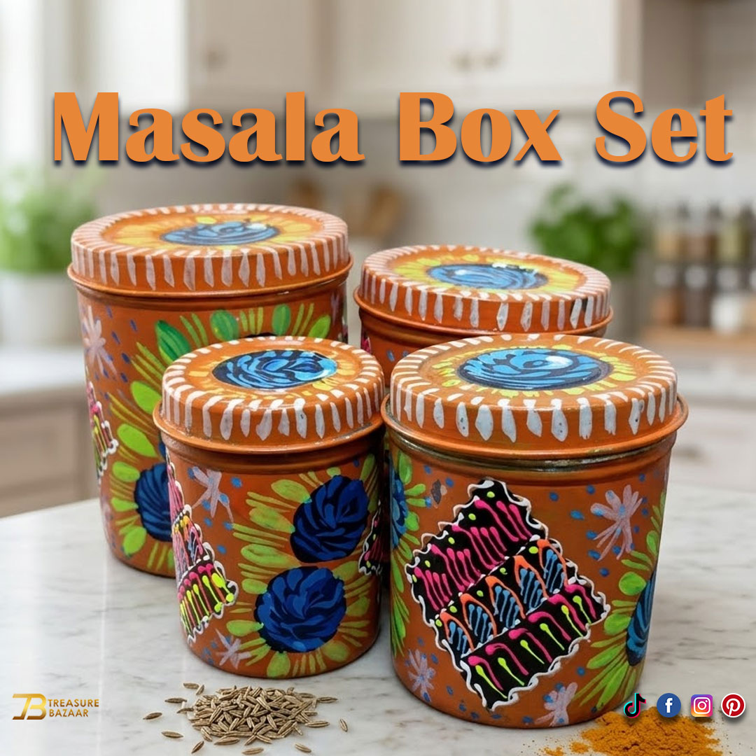 - Bring a touch of Pakistani tradition to your kitchen with this beautifully handcrafted Truck Art Masala Box Set. Each box is carefully hand-painted with vibrant colors and cultural motifs that reflect the charm of classic truck art. Designed with multiple compartments, it keeps your spices fresh, organized, and easy to access. Made from durable materials, it blends functionality with artistic elegance. Perfect for daily use or as a unique gift for home décor lovers.