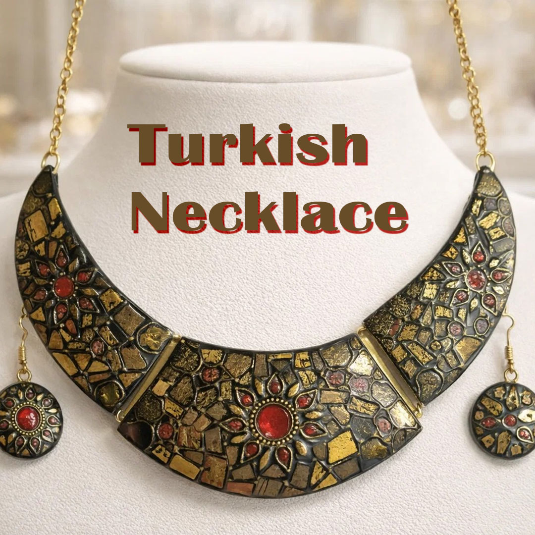 This beautiful Turkish necklace and earring set traditional mosaic artistry blended with a bold, elegant design making it perfect for festive wear, cultural events, or stylish everyday outfits. A perfect choice for those who love unique, artistic jewelry with a cultural touch.