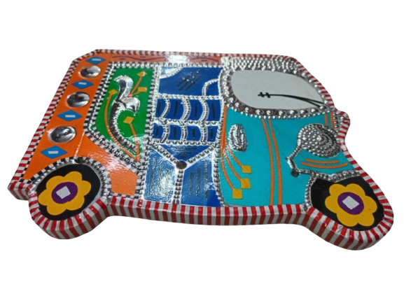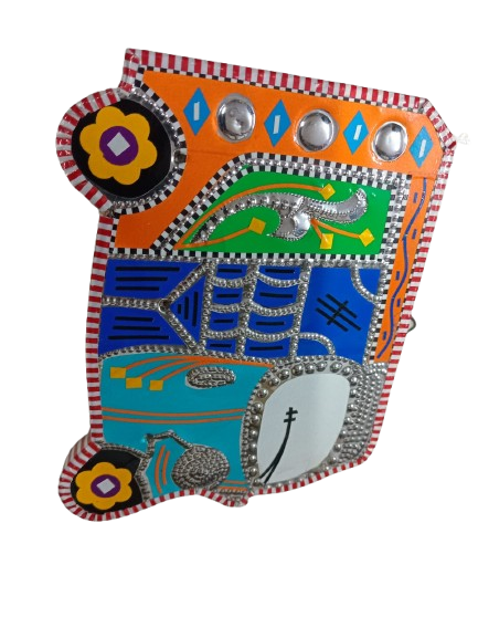 This eye-catching wall hanging celebrates the iconic rickshaw, a staple of South Asian urban life. Meticulously handcrafted, the piece showcases a blend of vibrant colors and traditional “truck art” aesthetics.